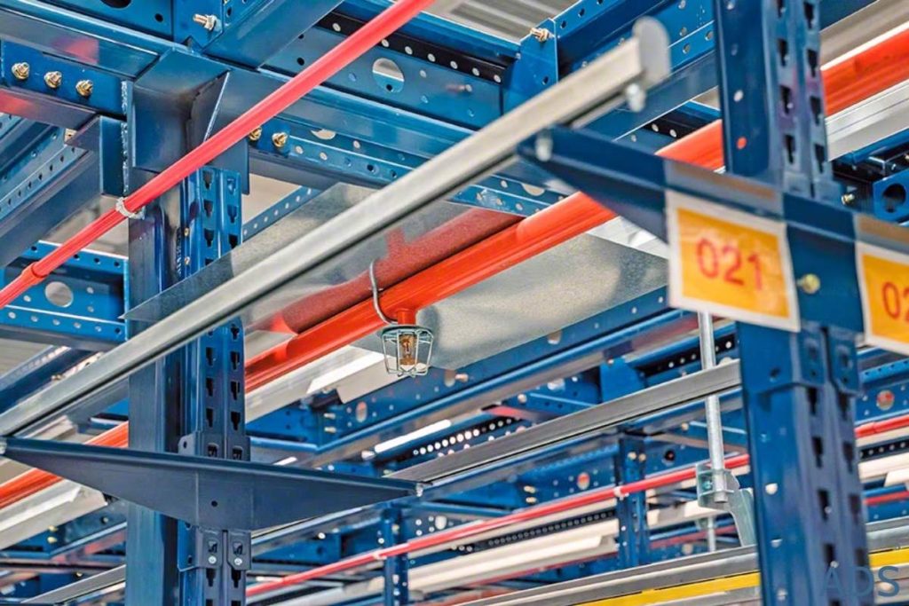 Les sprinklers en rack sont des têtes sprinklers installées directement à l'intérieur de la structure du rayonnage, généralement fixées sur les montants ou sur des supports dédiés, à une hauteur définie entre deux niveaux de stockage.